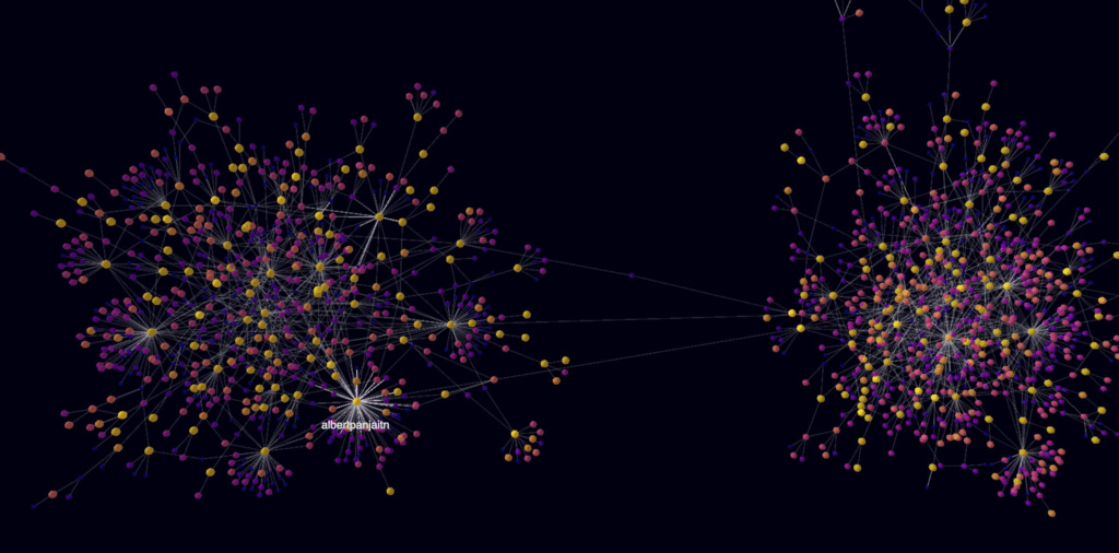 Meanwhile, visualization of retweet graph using d3.js 3d force graph:
