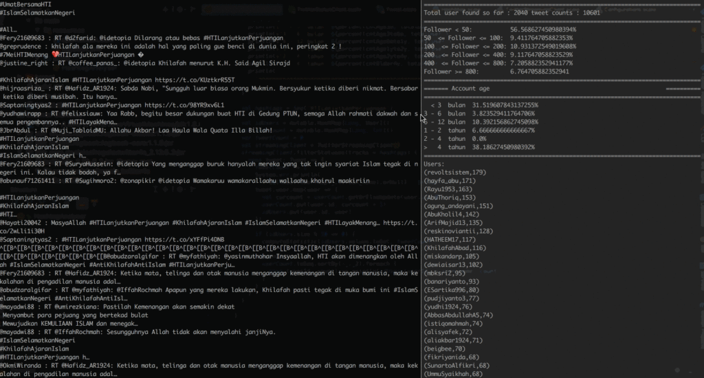 Unfortunately I have not yet found another curious trends to be analysed using this newly build, work in progress, udash based analyser, what I currently have is just previous result of original gist that shows skewed user attributes that promote a certain tag, related to Indonesian politics (#HTILanjutkanPerjuangan):