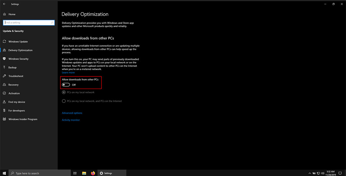 reg add HKLMSOFTWAREMicrosoftWindowsCurrentVersionDeliveryOptimizationConfig v DODownloadMode t REG_DWORD d 0 f