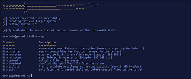 To use other forwarded shells you have to edit the script to change the url and the parameter of the webshell, but DFShell use parameters to quickly pass the arguments to the script (-u/–url and -p/–parameter), the script have a pretty output with colors, you also have custom commands to upload and download files from the target, do port and host discovery, and it deletes the files created on the victim if you press Ctrl + C or simply exit from the shell.