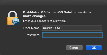 - Next, type your admin password to allow DiskMakerX to erase your thumb drive and copy the macOS Catalina files.