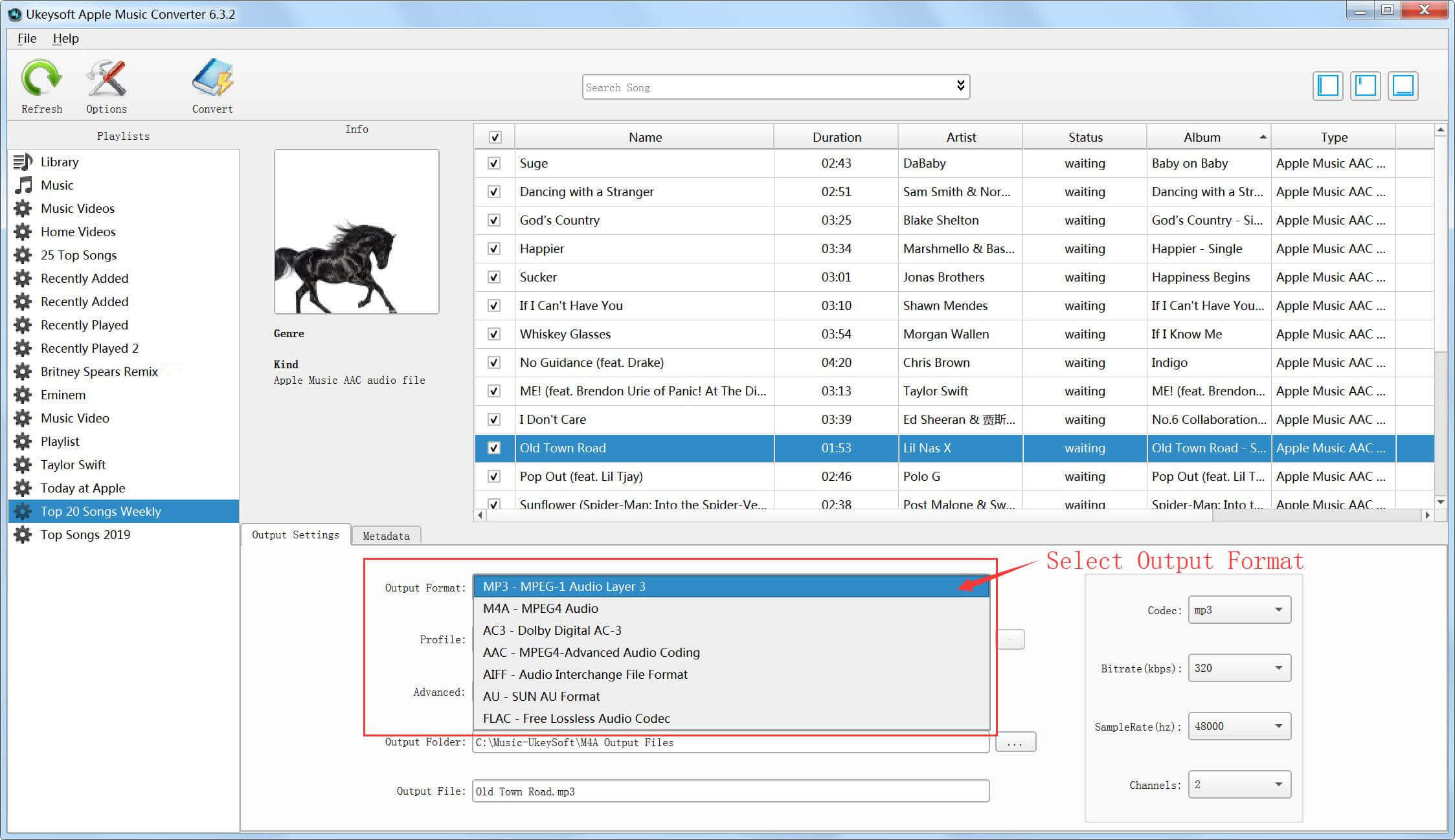 Step 3. Select the songs you want to convert and select output format you need, such as MP3, M4A, AC3, AIFF, AU, FLAC, M4R and MKA.