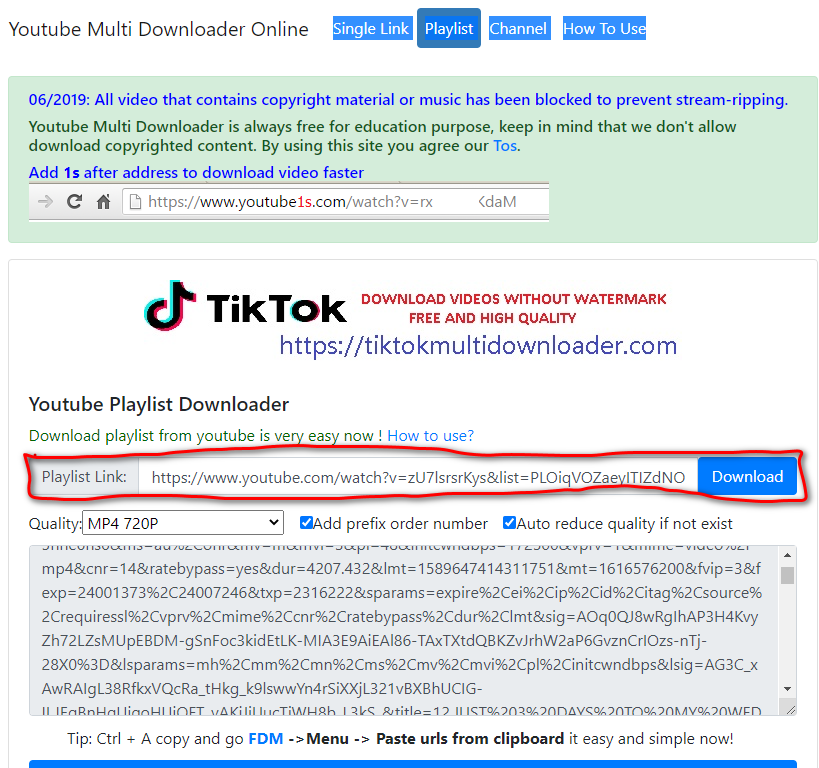 Another online playlist downloader for YouTube, called Youtubeplaylist.cc, is unique in that it lets you pick which videos from the playlist you want to download. However, one disadvantage is that it doesn’t download the videos in bulk; you have to either save them one by one or export the download link and use it in a download manager.