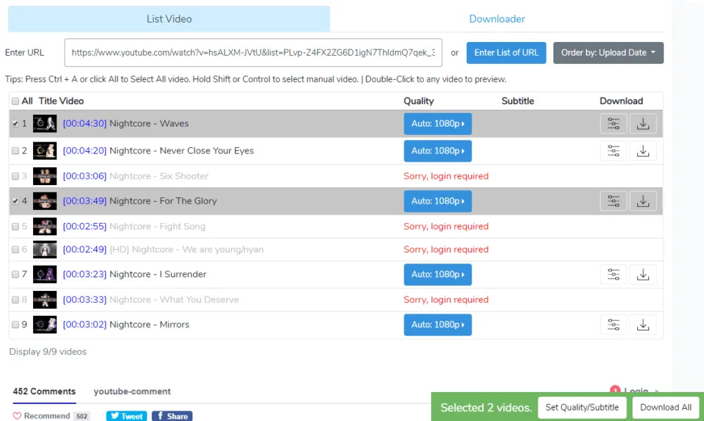 To download a YouTube playlist from this website, paste the link into the text box to immediately get a list of all the videos from that playlist. Select the videos from the playlist that you want to download, choose the quality you want for each one, and then select Download All at the bottom.