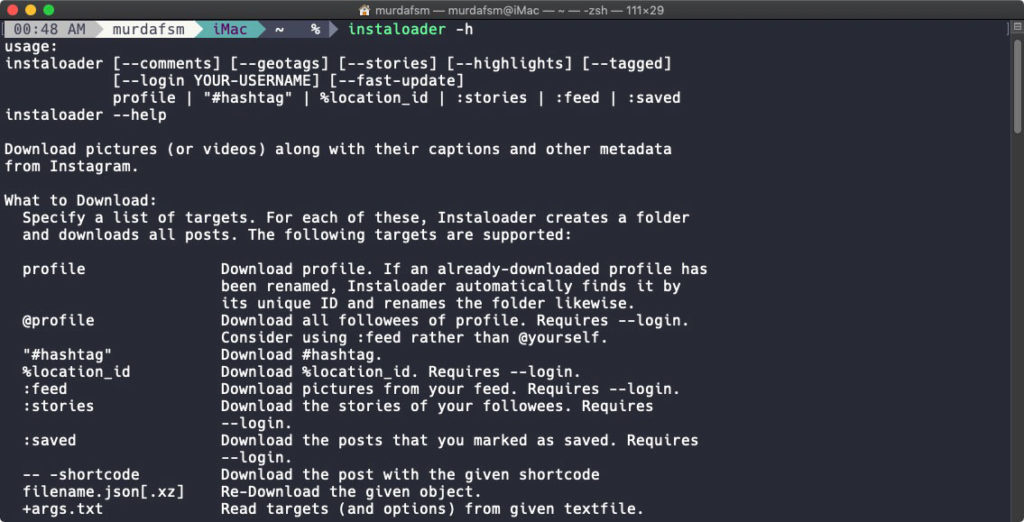 Instaloader has an amazing documentation that you can check here. Also don’t forget to check the help page.