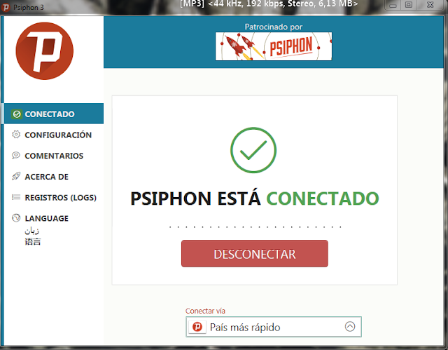 The first thing to do is to stop all downloads (square button), then open the Psiphon and connect. Once connected will open a window in the browser, which we could close without problem, but the Psiphon is left open.