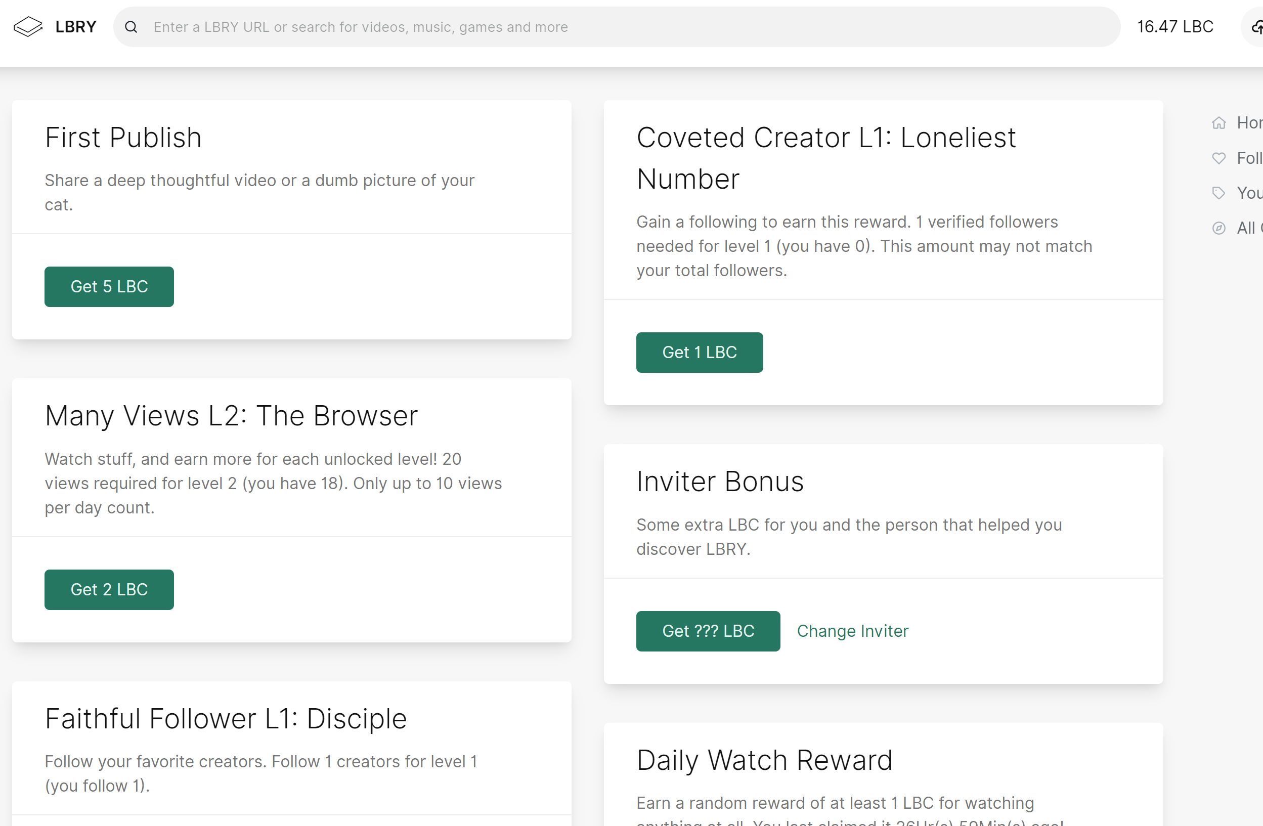 Thank you but, I’m sorry you do not qualify for our Rewards program. You can still use the LBRY without this feature and if you require LBC, they are avaialable to purchase on exchanges.