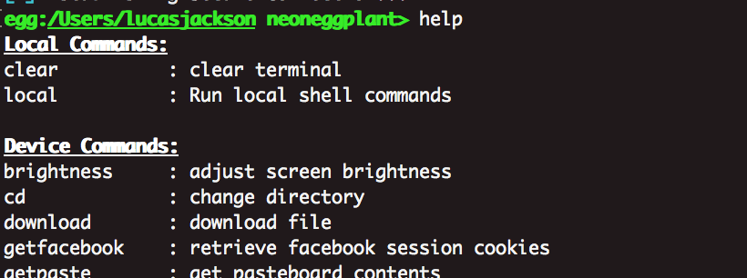 After a session is established, we can execute commands on that device through the EggShell command line interface. We can show all the available commands by typing “help”