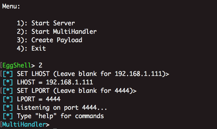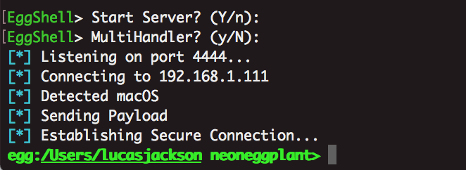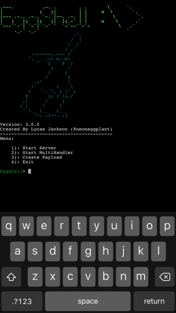 By using EggShell, you agree to the GNU General Public License v2.0 included in the repository. For more details at http://www.gnu.org/licenses/gpl-2.0.html. Using EggShell for attacking targets without prior mutual consent is illegal. It is the end user’s responsibility to obey all applicable local, state and federal laws. Developers assume no liability and are not responsible for any misuse or damage caused by this program.