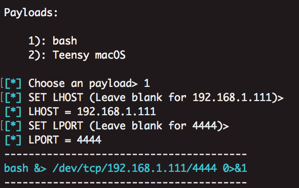 Selecting teensy will give us an arduino based payload for the teensy board.