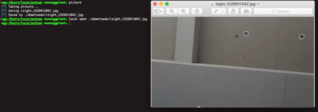 Both iOS and macOS payloads have picture taking capability. The picture command lets you take a picture from the iSight on macOS as well as the front or back camera on iOS.