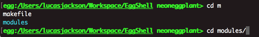 Similar to most command line interfaces, EggShell supports tab completion. When you start typing the path to a directory or filename, we can complete the rest of the path using the tab key.