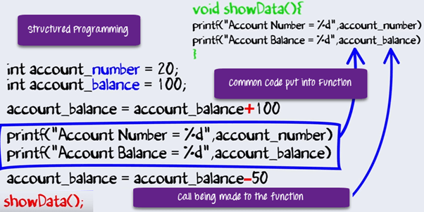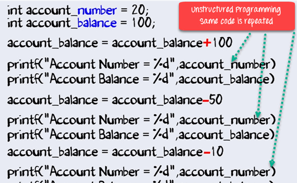 The earliest of all programming language were unstructured programming language. A very elementary code of banking application in unstructured Programming language will have two variables of one account number and another for account balance