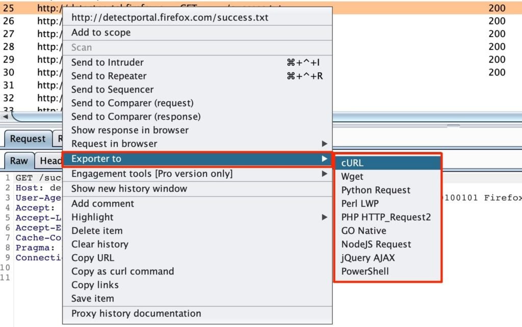 Exporter is a Burp Suite extension to copy a request to the clipboard as multiple programming languages functions.