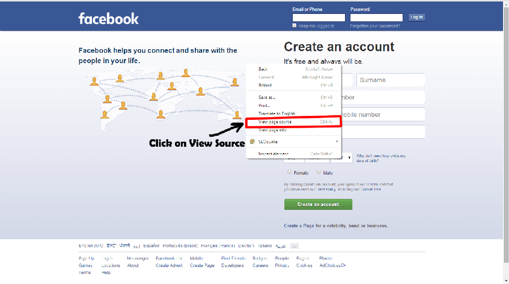 Now go to www.facebook.com (Make sure that you are logged out!).Now Right click anywhere on the facebook home page and click on “view page source” from the menu. Alternatively you can get the source code of any site like gmail, facebook that as login form and create the phishing page by following other steps as it is.