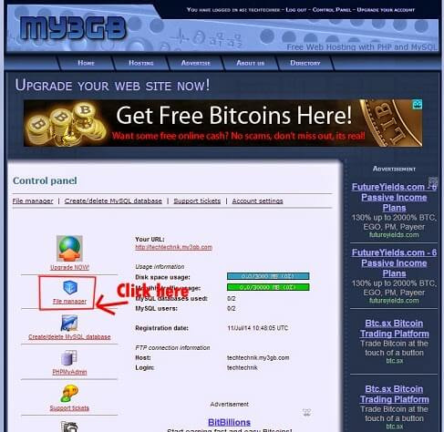 Now its time to upload the Phishing page that you created for facebook . Go to www.my3gb.com or any free hosting site(000webhost) and create an account if you don’t have account (It’s FREE). After creating your account on www.my3gb.com click on File manager. Or alternatively you can buy hosting plan from Ipage Hosting and never get ban