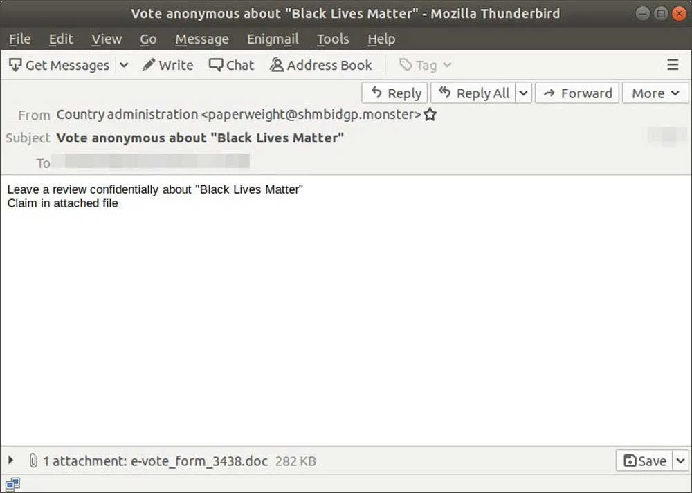 Such is the case with a new campaign discovered by cybersecurity organization Abuse.ch that pretends to be from “Country administration,” asking recipients to ‘Vote anonymous about “Black Lives Matter”.’