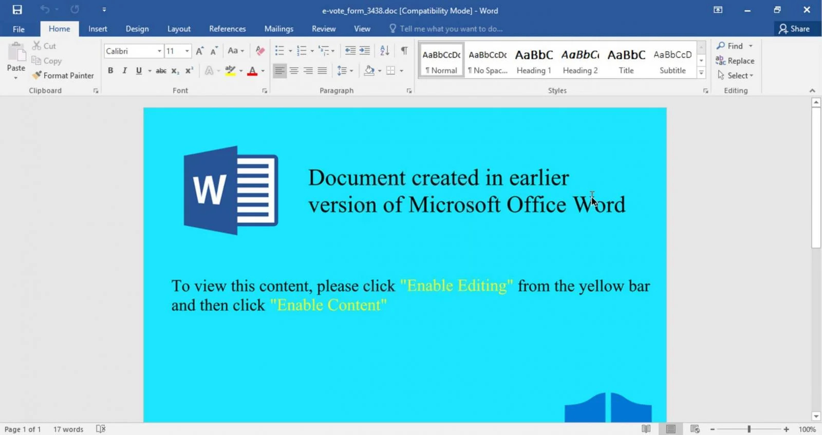 When a recipient opens the Word document, they will be greeted with a message stating that they need to click on the ‘Enable Editing’ and ‘Enable Content’ buttons to view the contents properly.