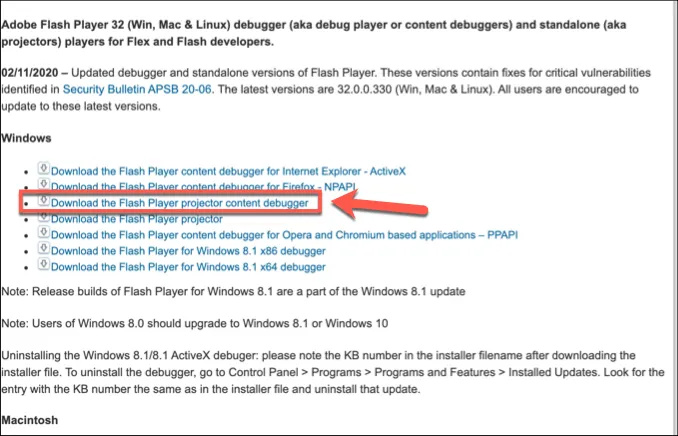 - At the moment, you can download this from a non-maintained Adobe support page. Click the Download the Flash Player projector content debugger option for your operating system, then run the file.