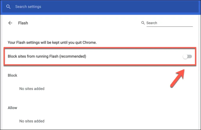 - This will bring up the Flash settings menu . You can also access this by typing chrome://settings/content/flash on the address bar. To allow Flash to run, click the Block sites from running Flash (recommended) slider. The slider will change to blue, and the option will change to Ask .
