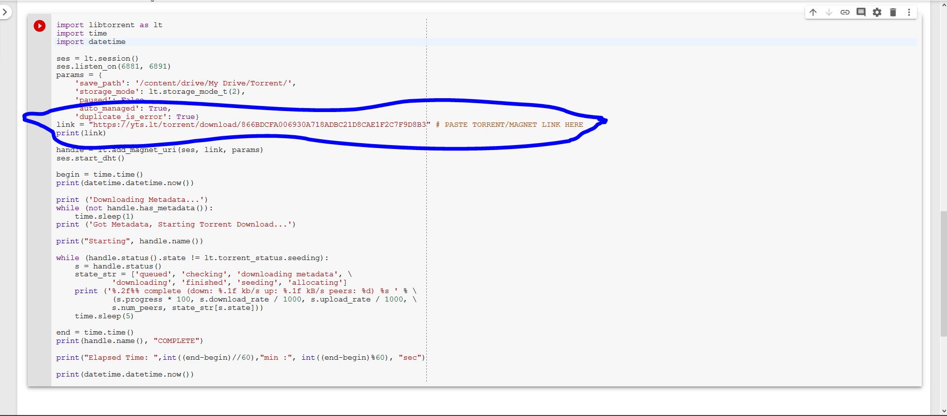 and click on the arrow near “import libtorrent as lt” to run the code.