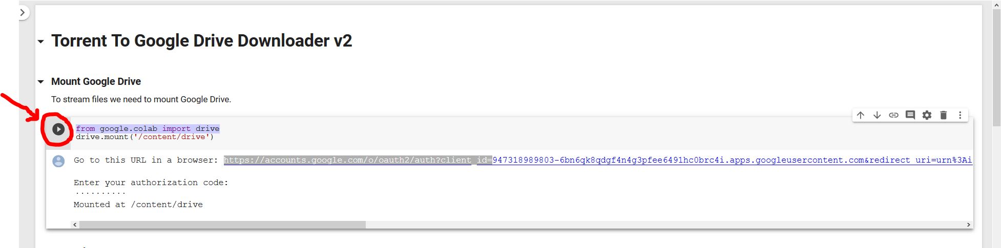 7. Now you need to install the libtorrent library. Just click on the arrow near to “!apt install python3-libtorrent” and let the script run.