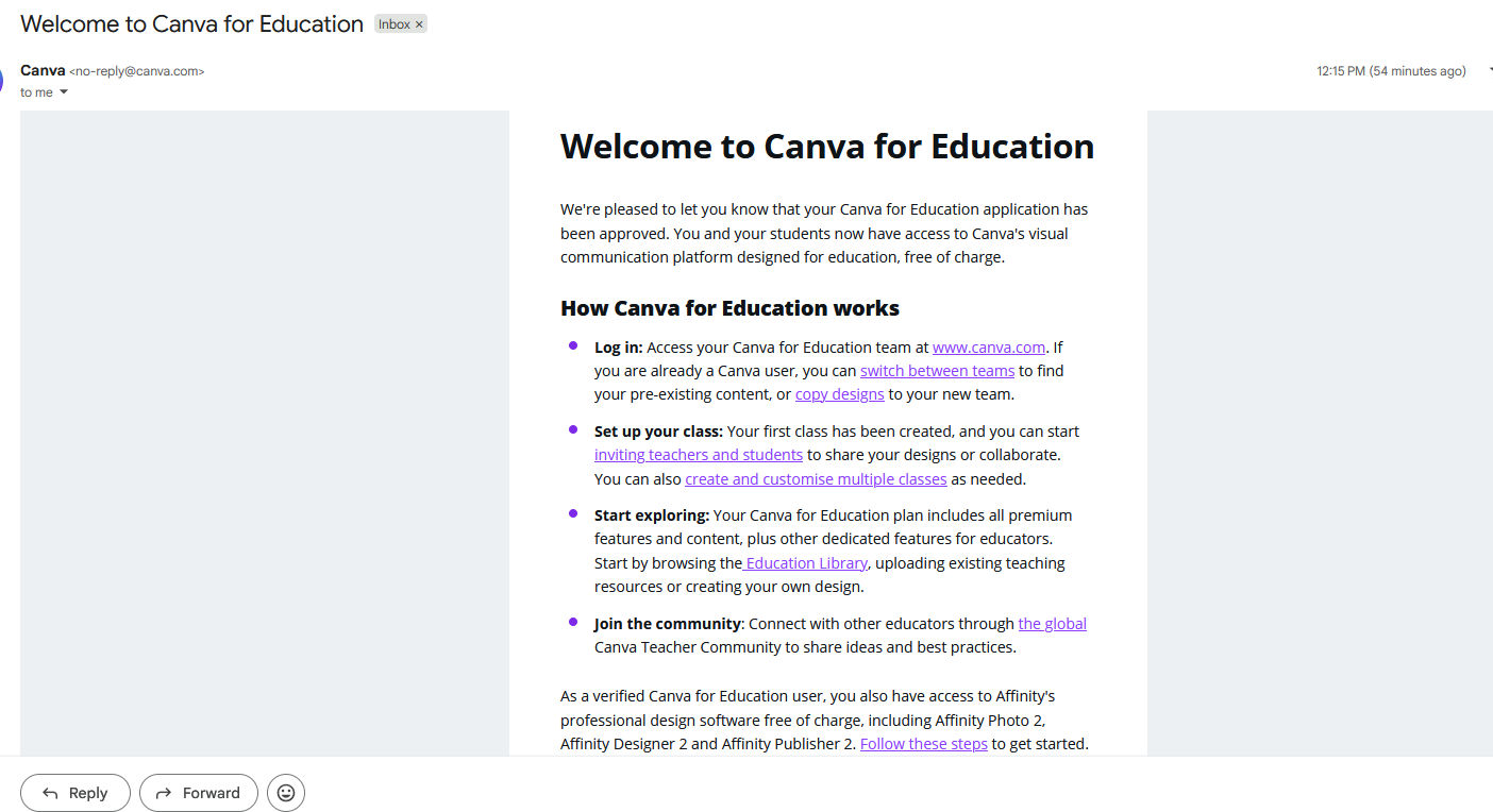 | We’re pleased to let you know that your Canva for Education application has been approved. You and your students now have access to Canva’s visual communication platform designed for education, free of charge. |
