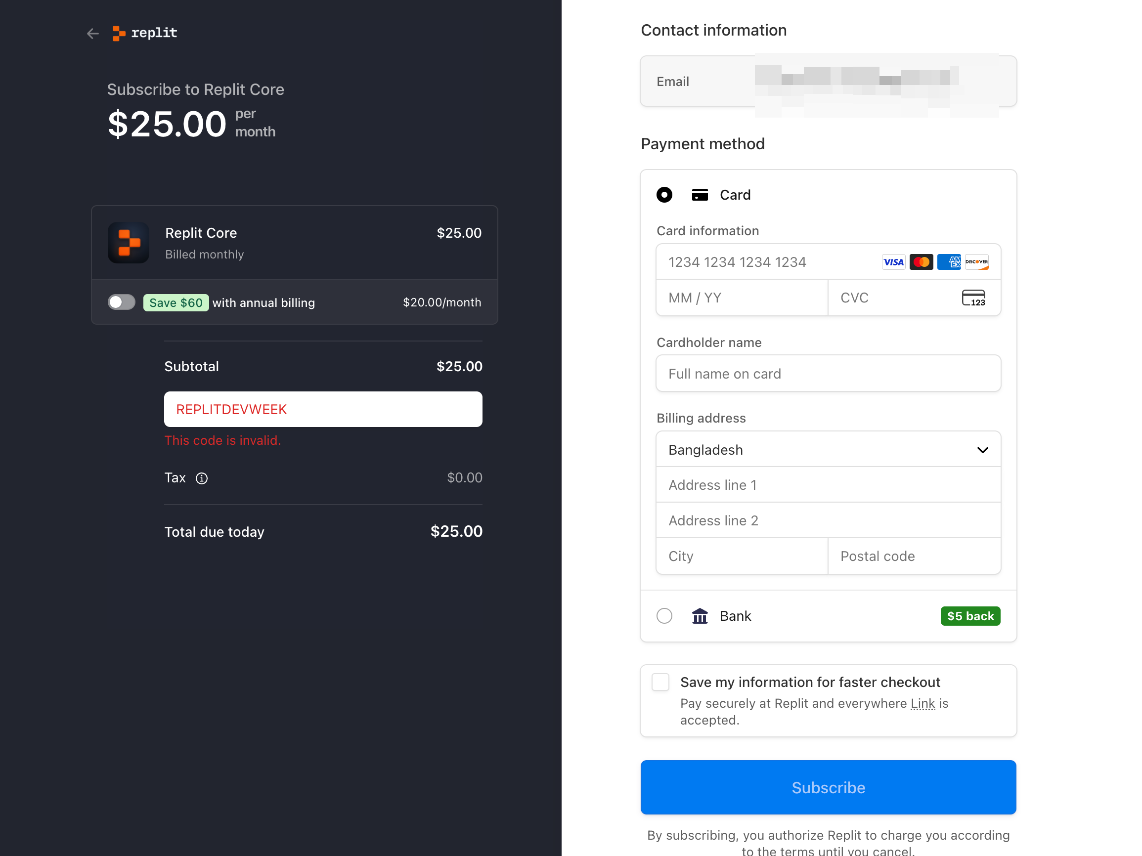 Step 5 β Apply promo code: REPLITDEVWEEK
