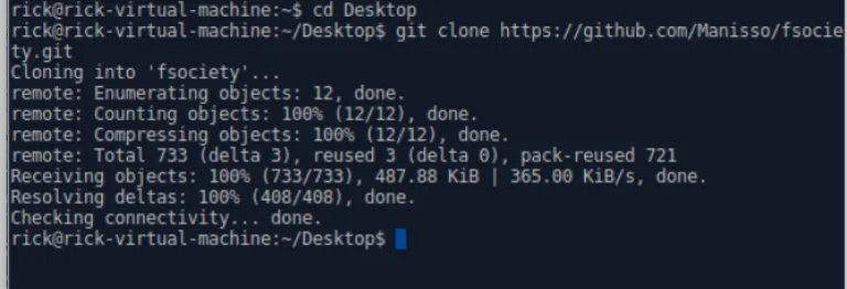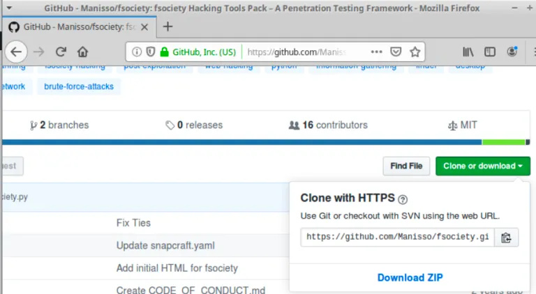 So at first we have to goto google and search for the tool fsociety, and then we have to click on that github link page..Now we have to copy the repo…. We are going to cloning the repo into our kali machine