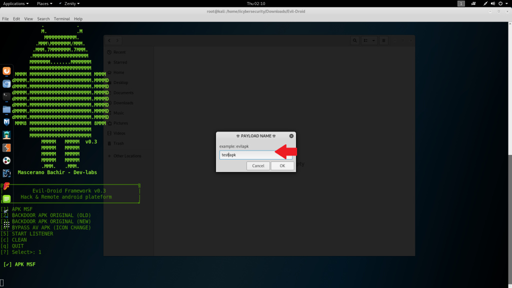 - Type malicious apk name. Type testapk