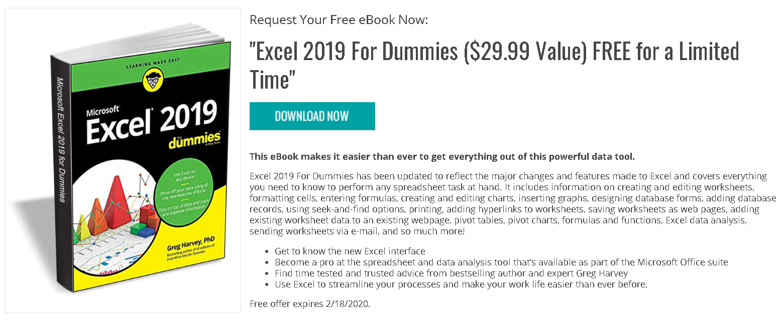 Microsoft Excel 2019 For Dummies is an eBook from Wiley that normally sells for USD $29.99. Now its available for free, you can visit this TradePub website for reg and download, or get it at link below