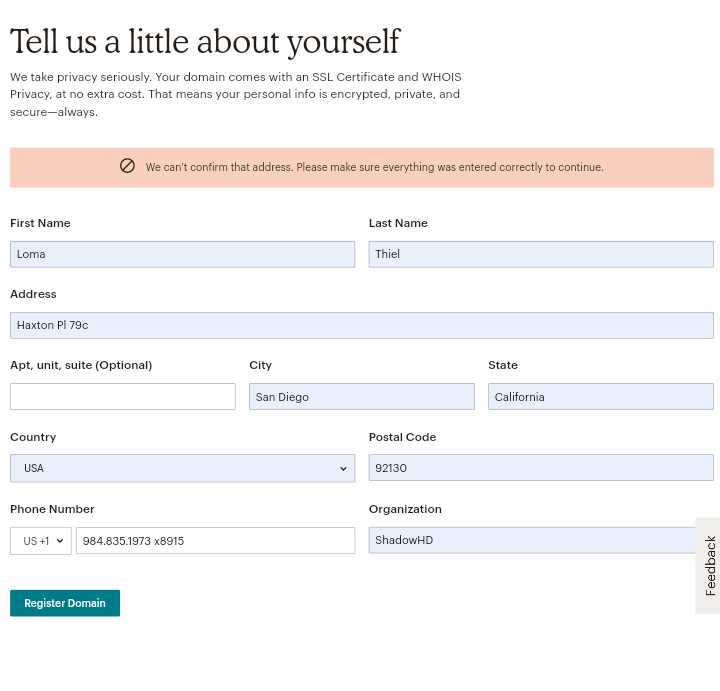 Cant register to a domain , cannot verify my address also use some real address on google maps and fake address still same. When ı use my real address not accept