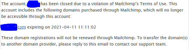 Actually yesterday I recieved a mail saying I have violated policies of use of MailChimp. I am being requested to transfer domain to somewhere else, now that it’s not been 60 days we can’t transfer it to somewhere else, just got stuck here. I believe I never broek any of such policies still they did it.