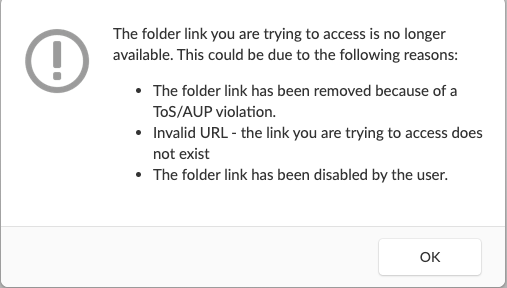 Link is not working whenever i try to open it shows. “The folder link you are try to open is no longer available”