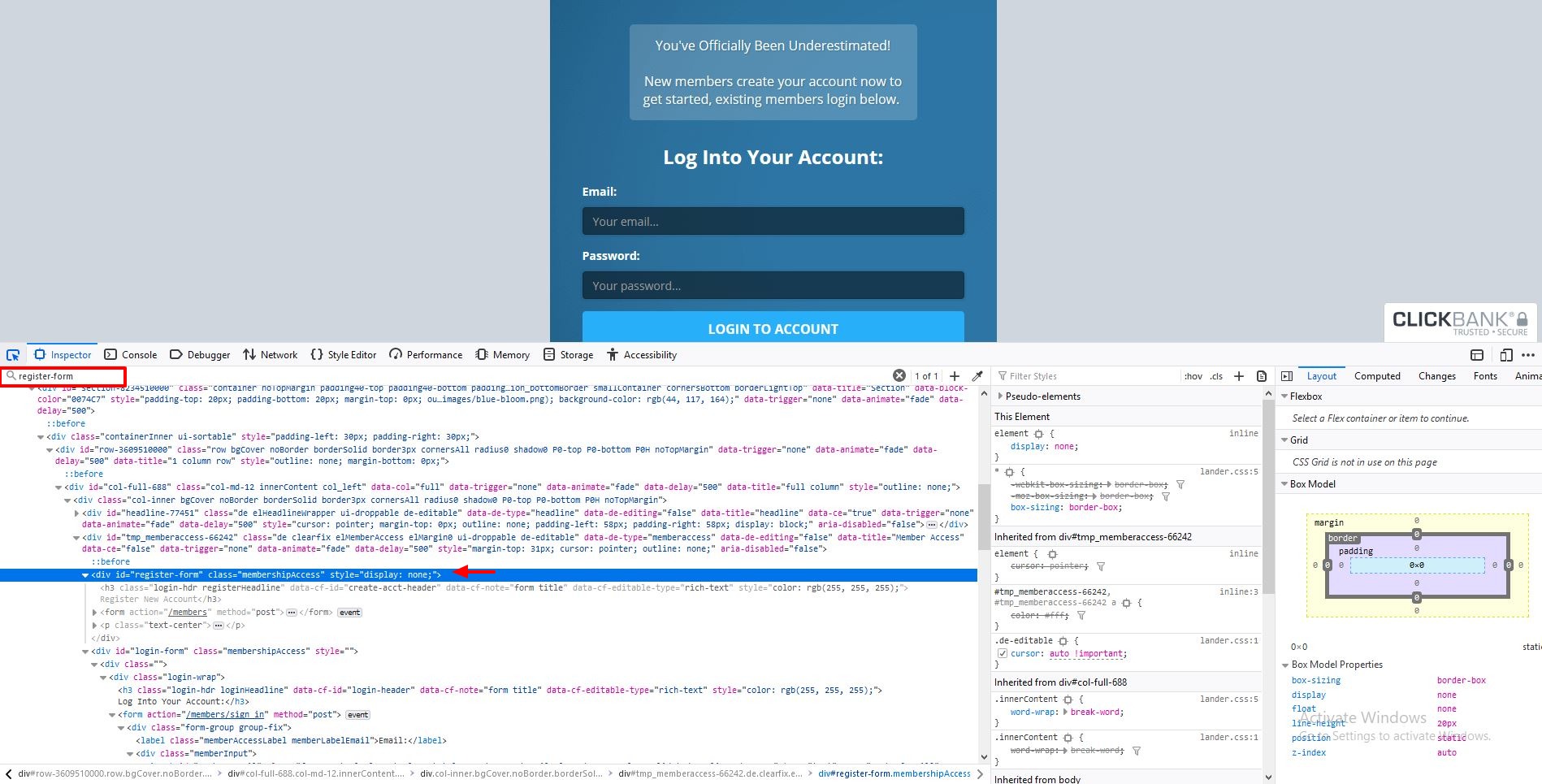 Next to “register-form”, Select and Delete the part that says “display: none;”