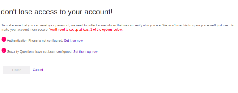 Complete anyone of two, either Phone or security questions (I prefer questions)