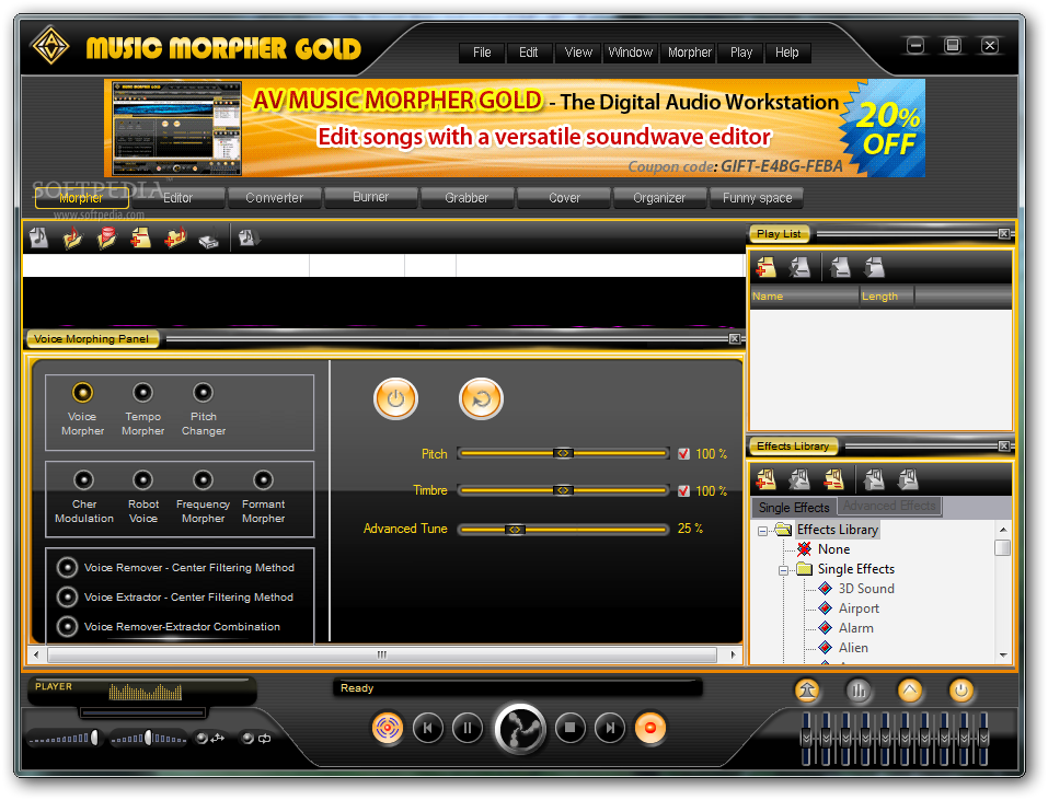 AV Music Morpher helps you to morph the vocals from a male to a female voice or vice versa, and add special audio effects to the music at the same time. Your favorite music will get more unique than ever, and you will have a whole new experience in creating and enjoying music. Bring new life into your music