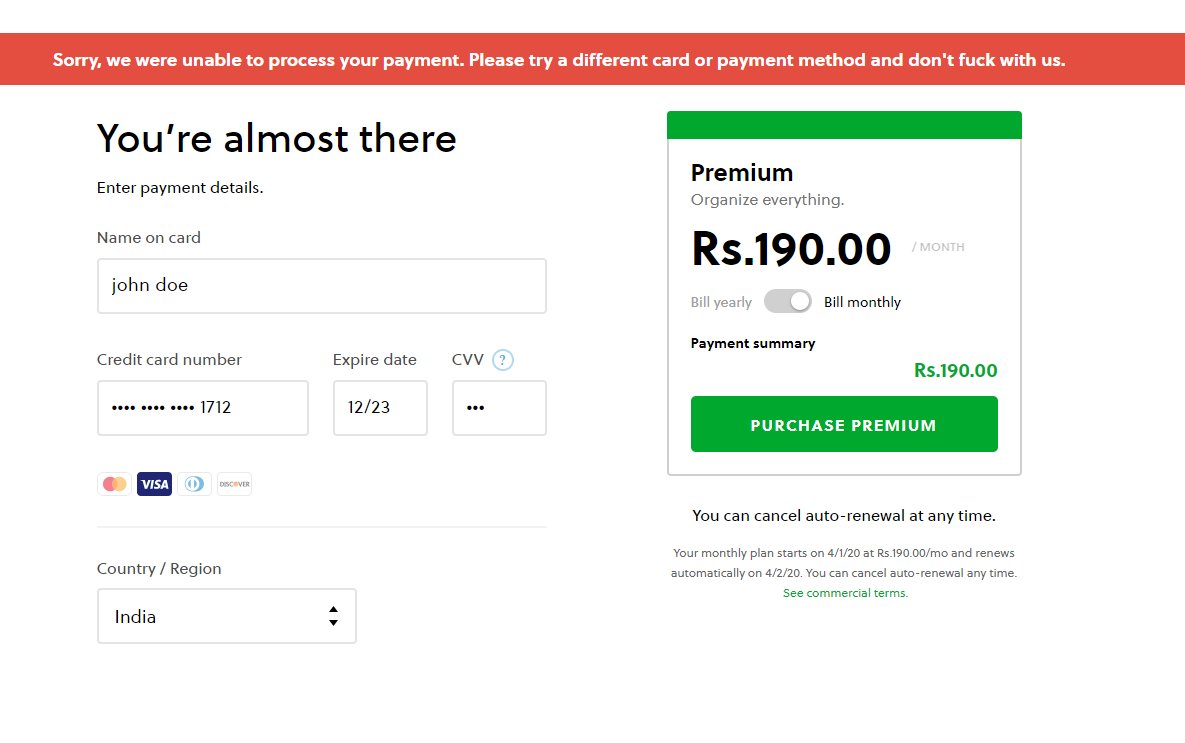 try different cards …for me to work i tried maybe 4-5 random cards with same Expiry date