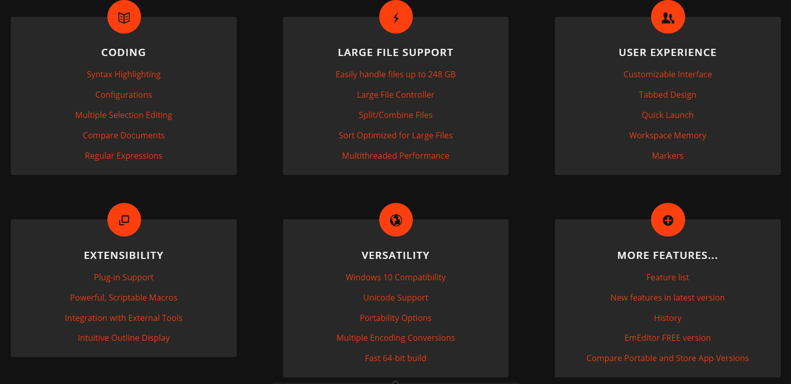 EmEditor is one of the few editors I know that has been built for both 32- and 64-bit modes. If you have a 64-bit operating system, why shouldn’t you be using a 64-bit editor? You can edit files larger than 4GB even on 32-bit Windows, but 64-bits makes the editor run even faster and keep more in memory before using temporary space.