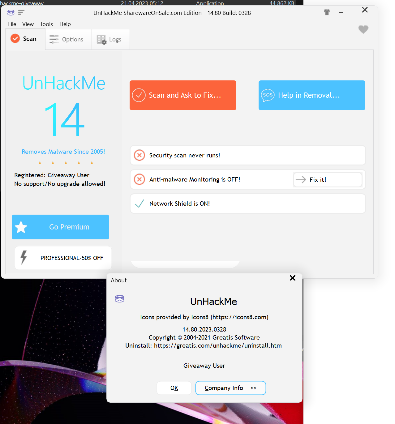 Step 1. Download the giveaway installer for v17.80 ā> UnHackMe_v17.80.exe