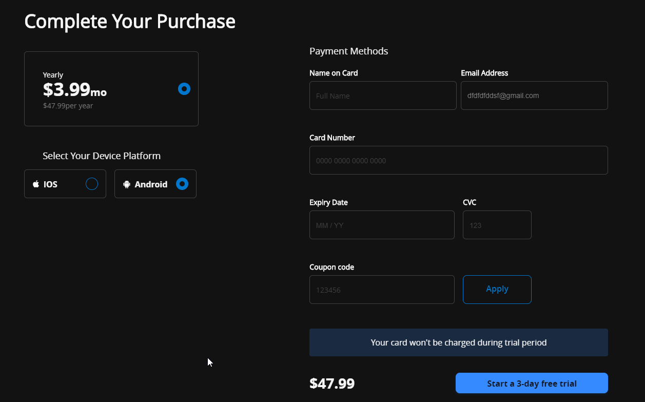 Don’t worry about the amount it shows there or the coupon code. Use a Credit Card Generator to generate a card with the following details: