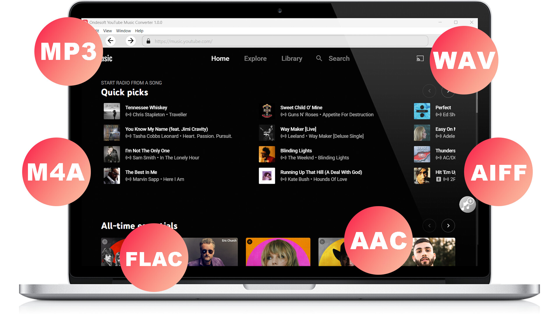 - Ondesoft YouTube Music Converter is a professional YouTube Music converter tool that can help you converter effortlessly output tracks in a variety of formats such as MP3, M4A, AAC, FLAC, WAV, and AIFF.