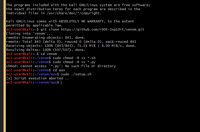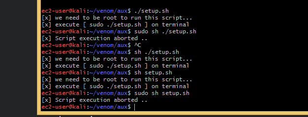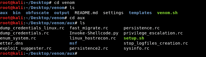 Now change the directory to the venom folder and again change the directory to the aux folder which is inside the venom folder. Here you will see a script named with setup.sh . If you are a root user, you must take permission to run this shell script. Don’t worry, just follow the commands.