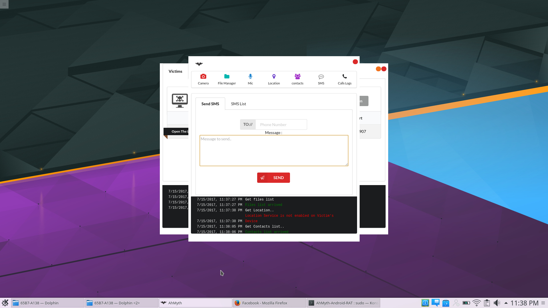 Using AhMyth SMS messages can be sent from the compromised Android devices to other mobile devices. AhMyth can also view SMS Lists from the target Android devices.