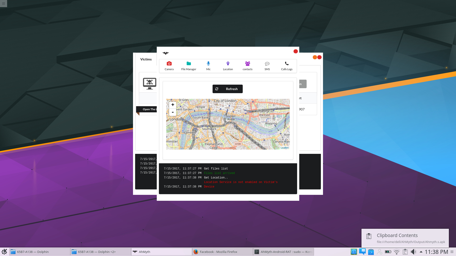 Ahmyth is an open source remote access tool and has many features you would expect to see in a RAT such as Geo location monitoring, SMS modules, Contact Lists Viewer, File Manager, Camera Snapshots, Microphone recorder and much more. AhMyth is very easy to use due to its simple and effective GUI design and is a multi-platform remote access tool that is available for Linux, Windows & Apple OS.