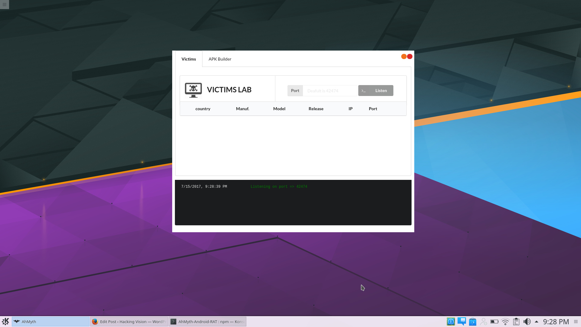 Screen shot shows AhMyth server running on port 42474