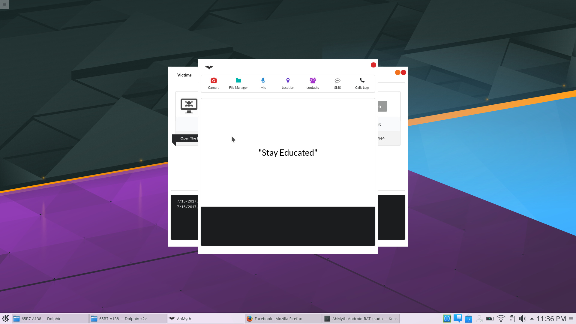 Once an Android device has been compromised. Each time you open a session with the device a windows will be displayed with the the words “Stay Educated”. From the menu within the window we can use various exploit modules.