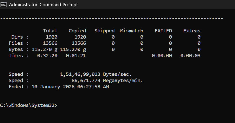 Real result from this guide: 115GB moved in 81 seconds. Thatβs 1,445 MB/s. Thatβs insane. Thatβs yours now.
